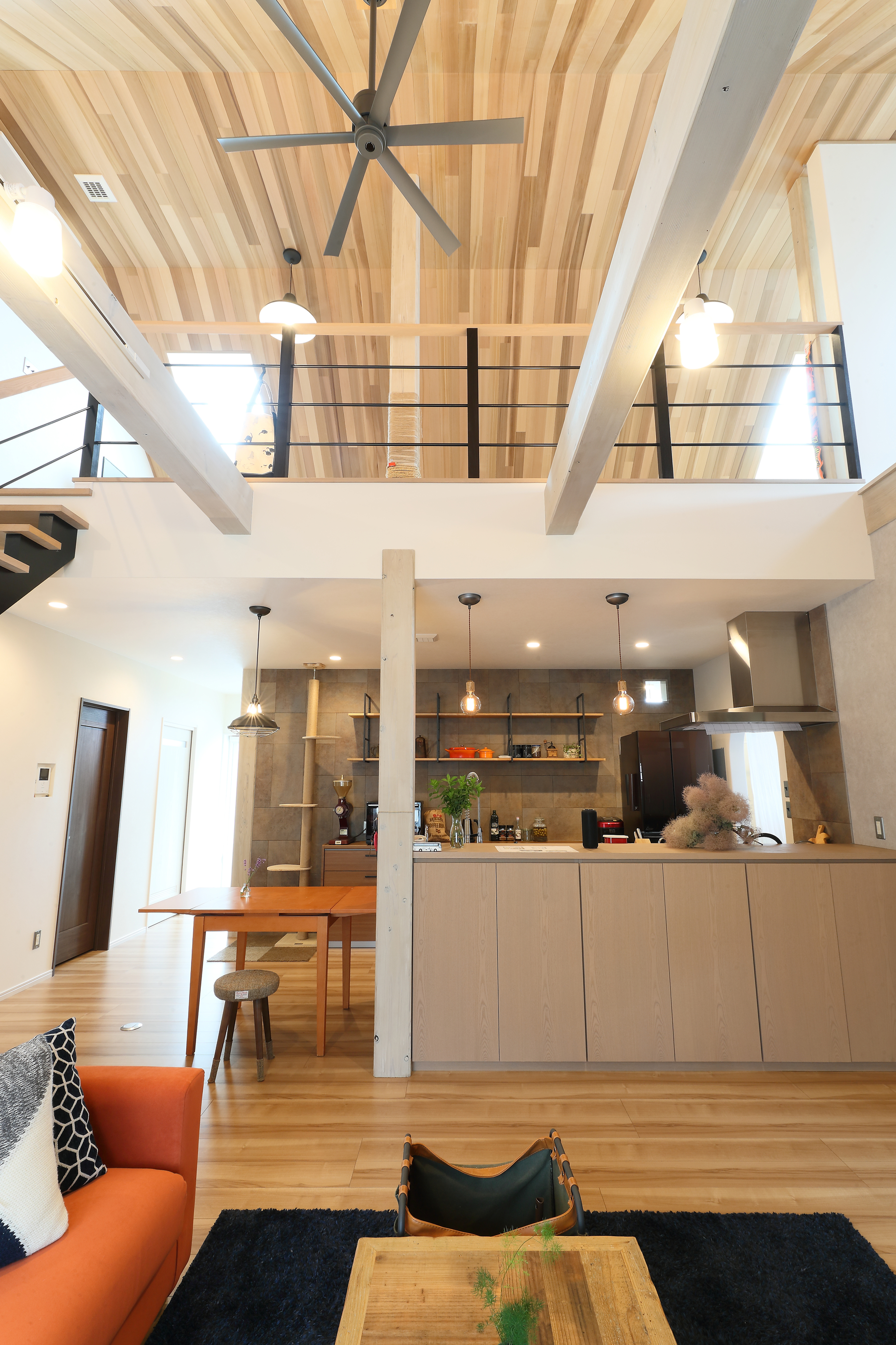 勾配天井の吹き抜けの米松の梁はグレーペイント・天井材は米杉の板張りにしてナチュラルに