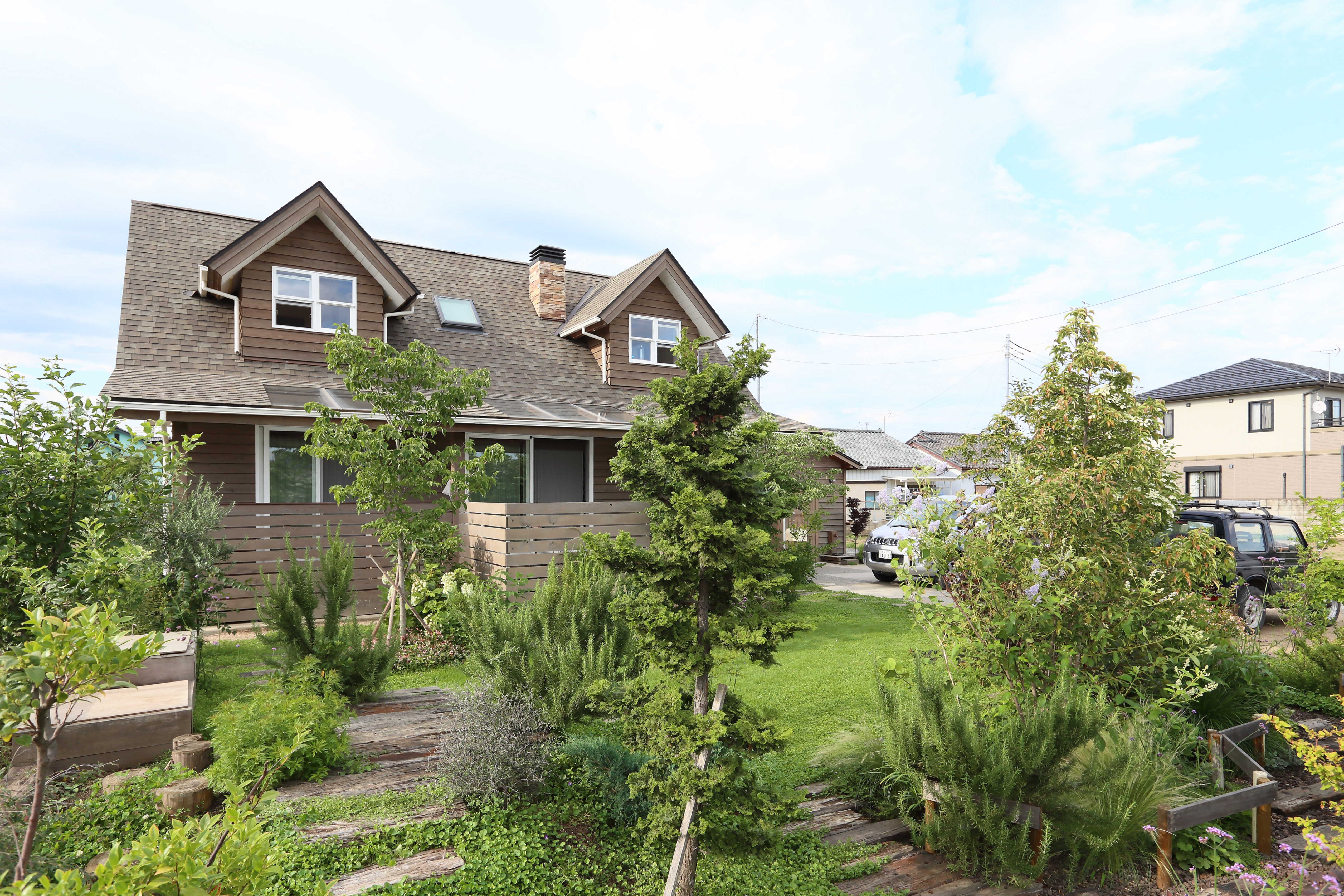 グラスファイバーシングル葺きの屋根・米杉の板張り外壁・深い軒とウッドデッキの外観は唯一無二の存在感があります。