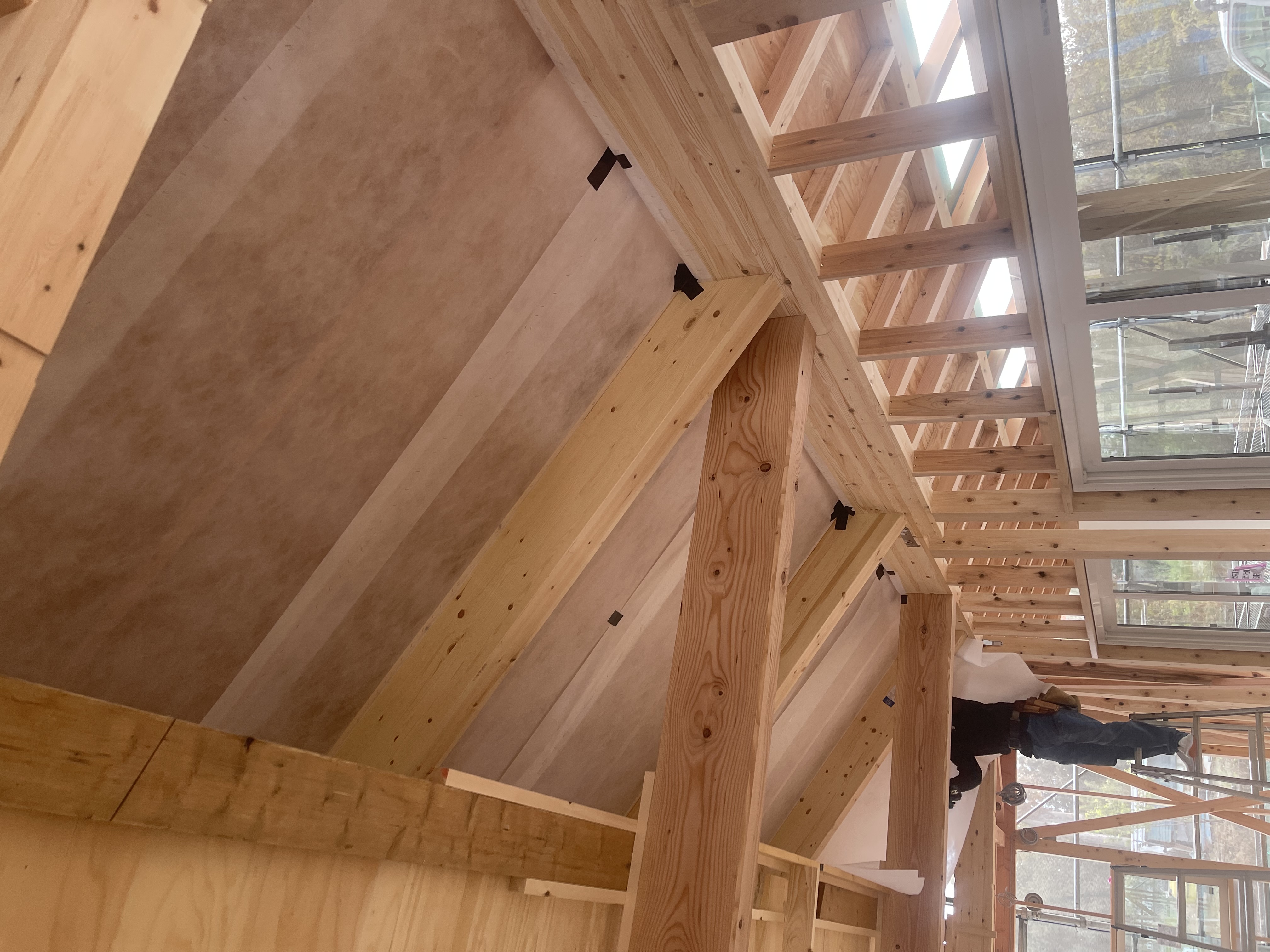 非常に手間がかかる造りですが、屋外通気層と断熱材、気密層と室内通気層のある勾配天井になります。
