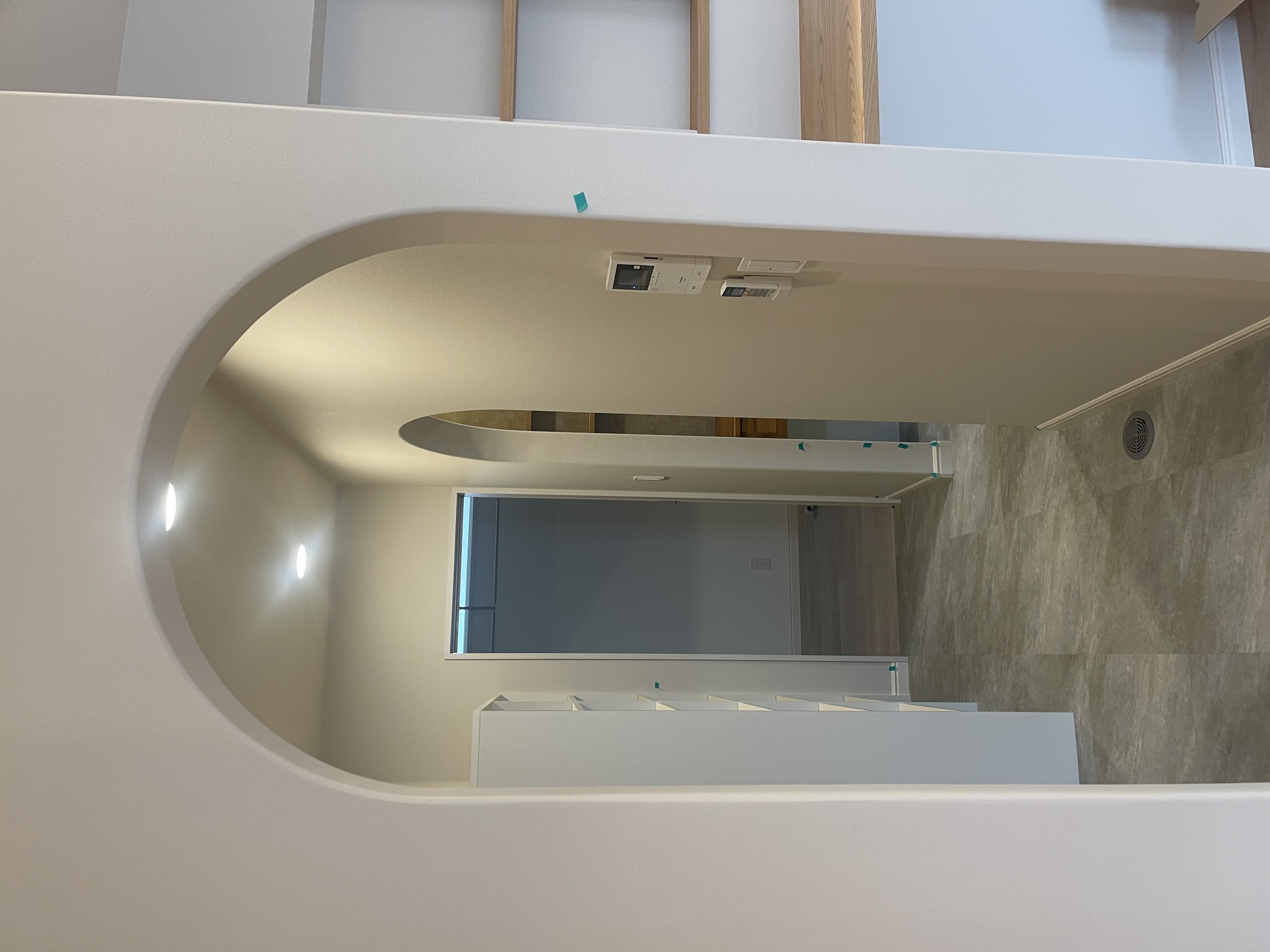 大工工事が終了し内装工事の職人さんがアールの下がり壁のクロスを施工している時に私は声を掛けました。