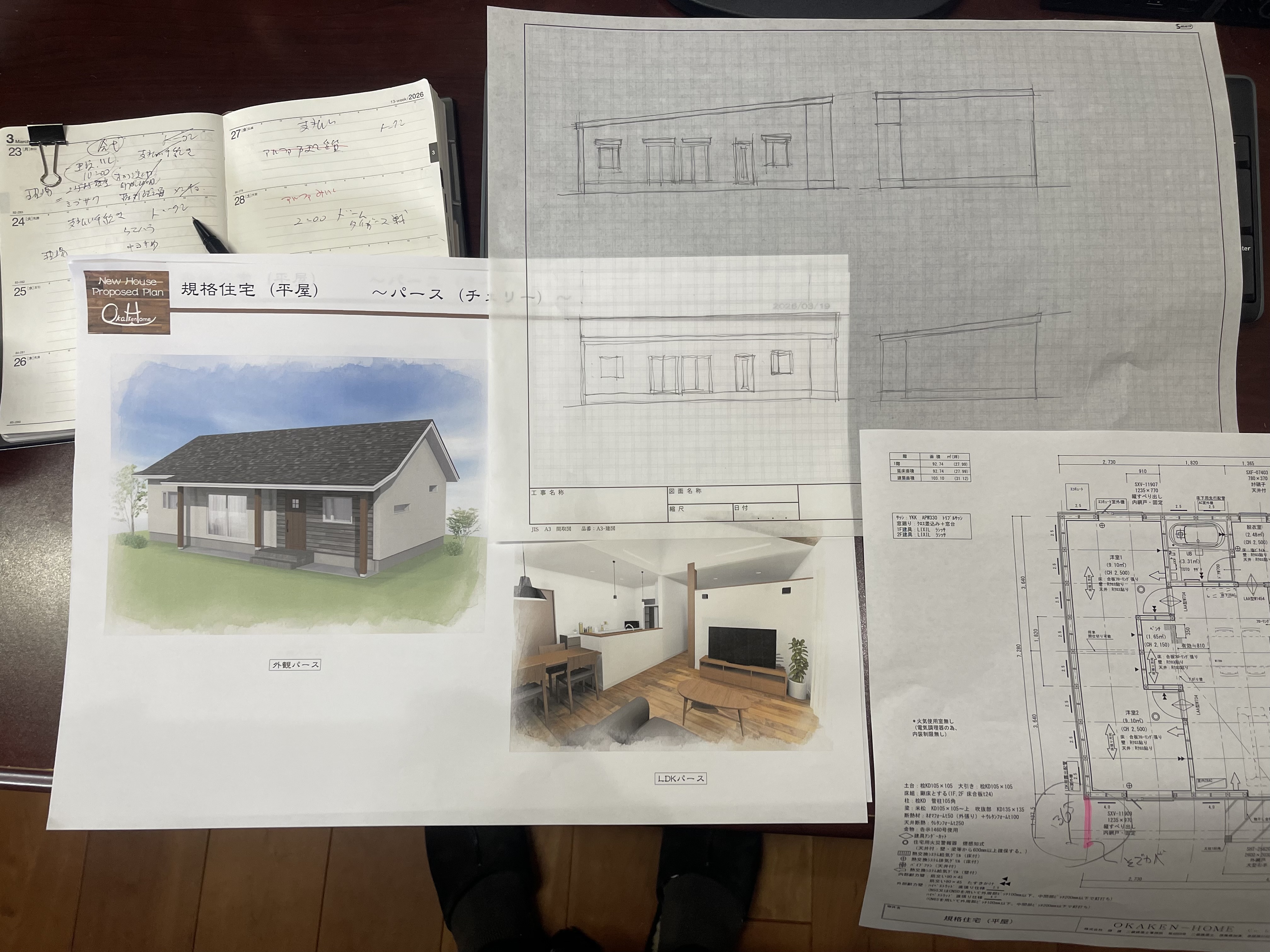 規格住宅であるHIRAYAの間取りが決まり外観パースを作図しチェックしています。