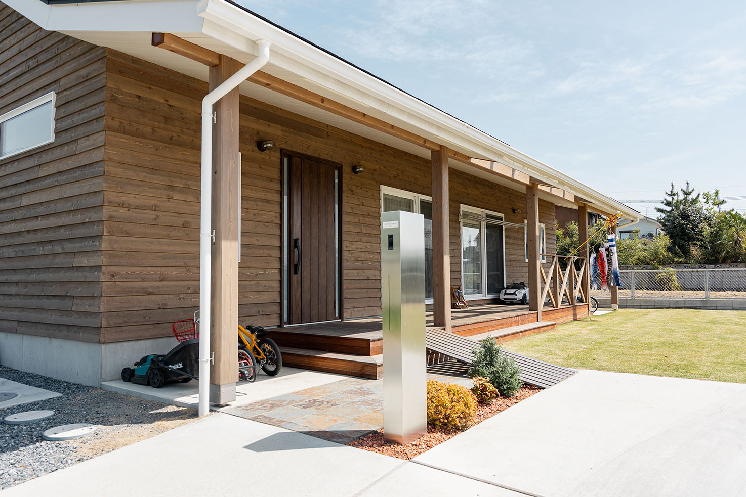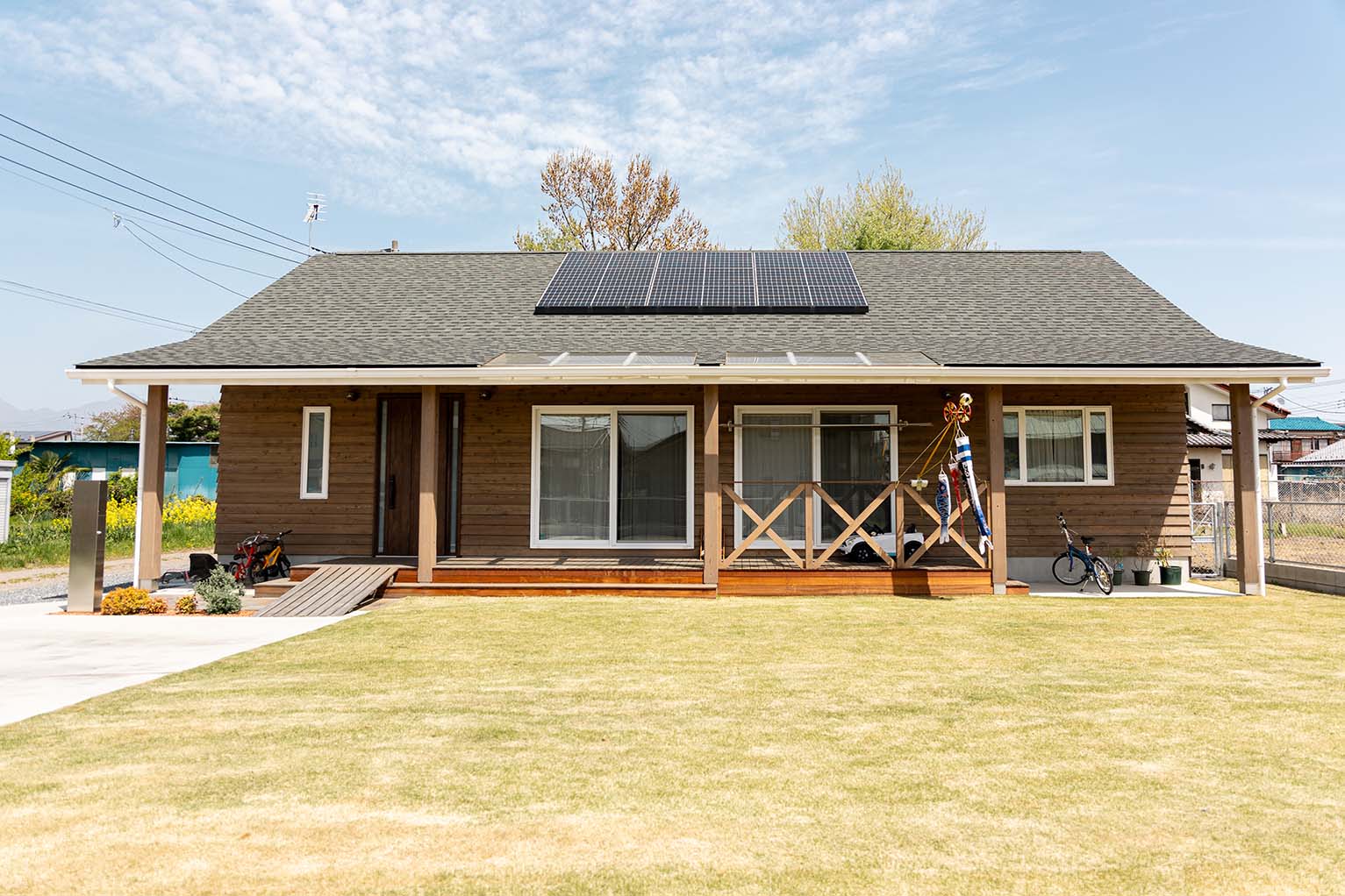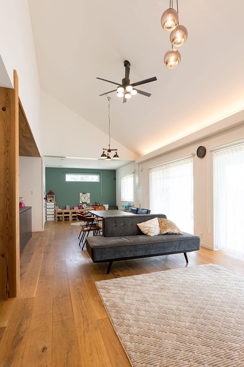 キッチンを中心とした回遊動線、造作の4枚引き戸を開けるとリビングからフリースペースまで一間続きにする事ができる大空間、生活スタイルが変化しても使いやすい間取りになっています。