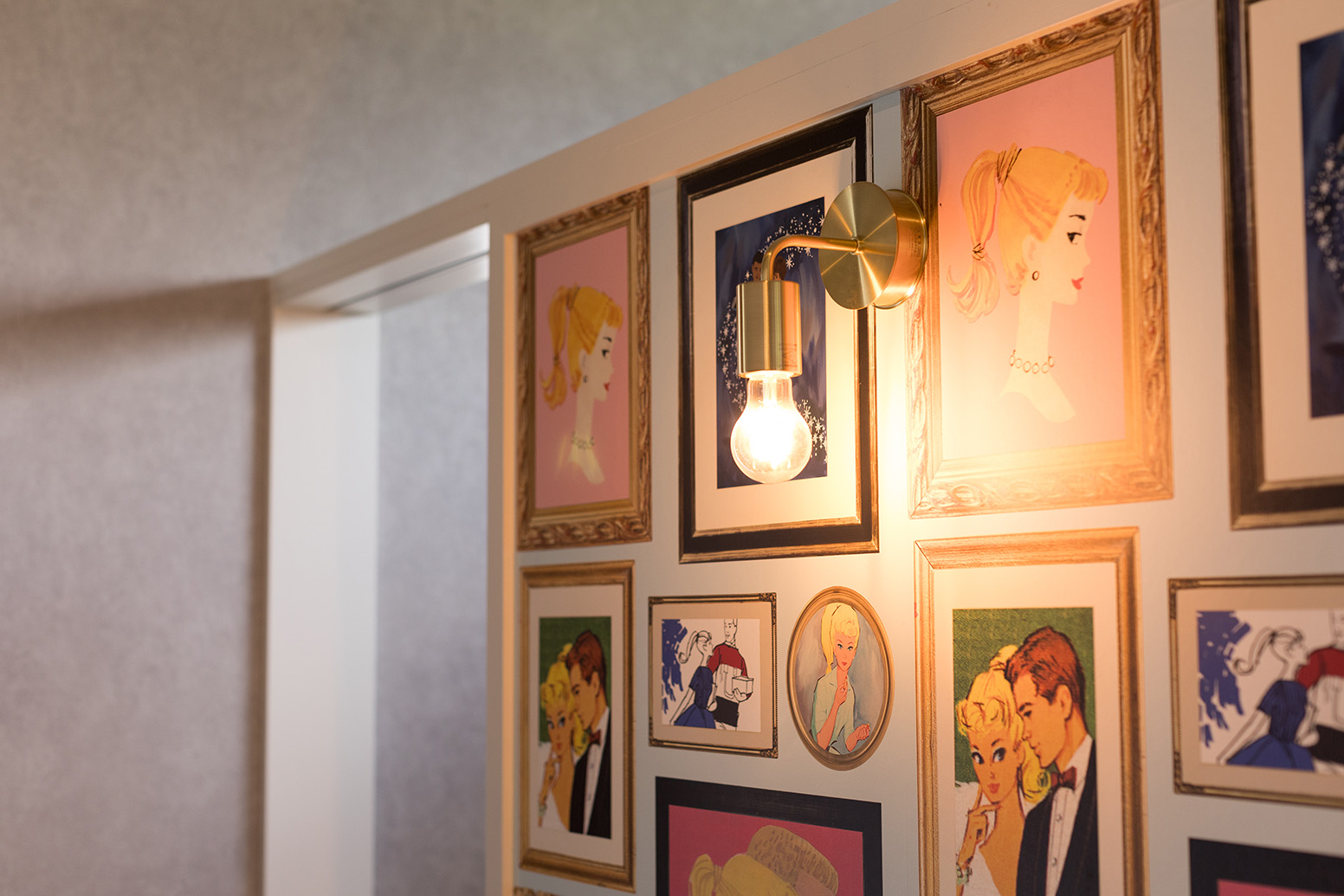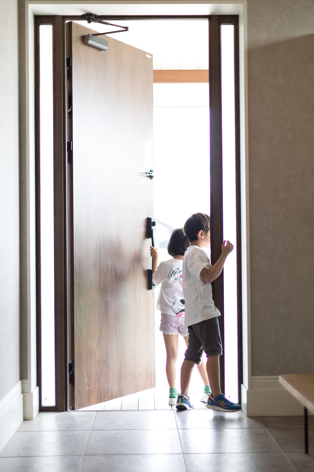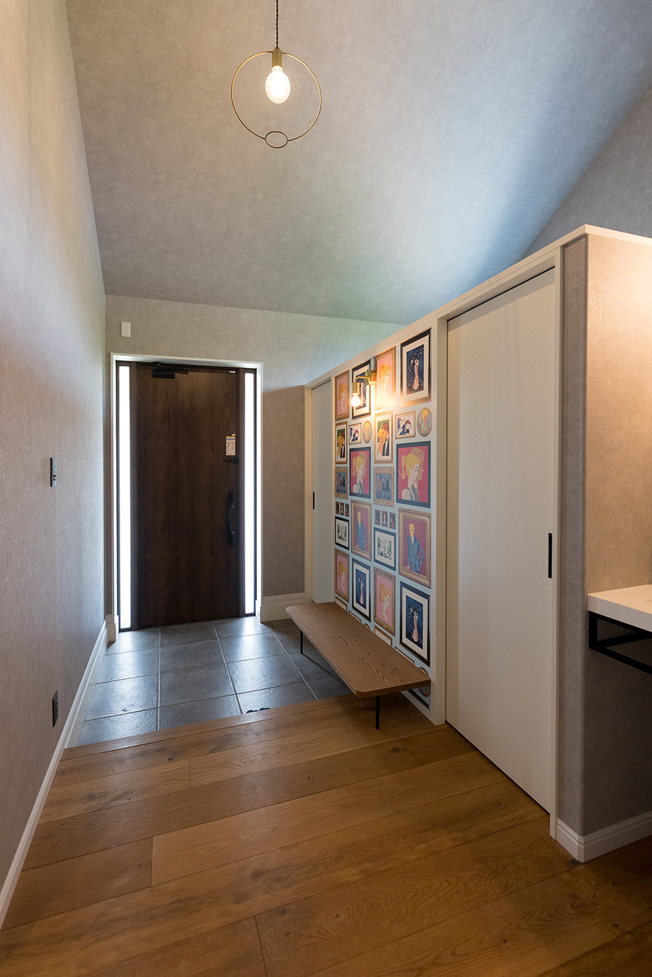 玄関はシックなグレー色を基調とし、一部分壁画のようなアクセントクロスを貼りました。