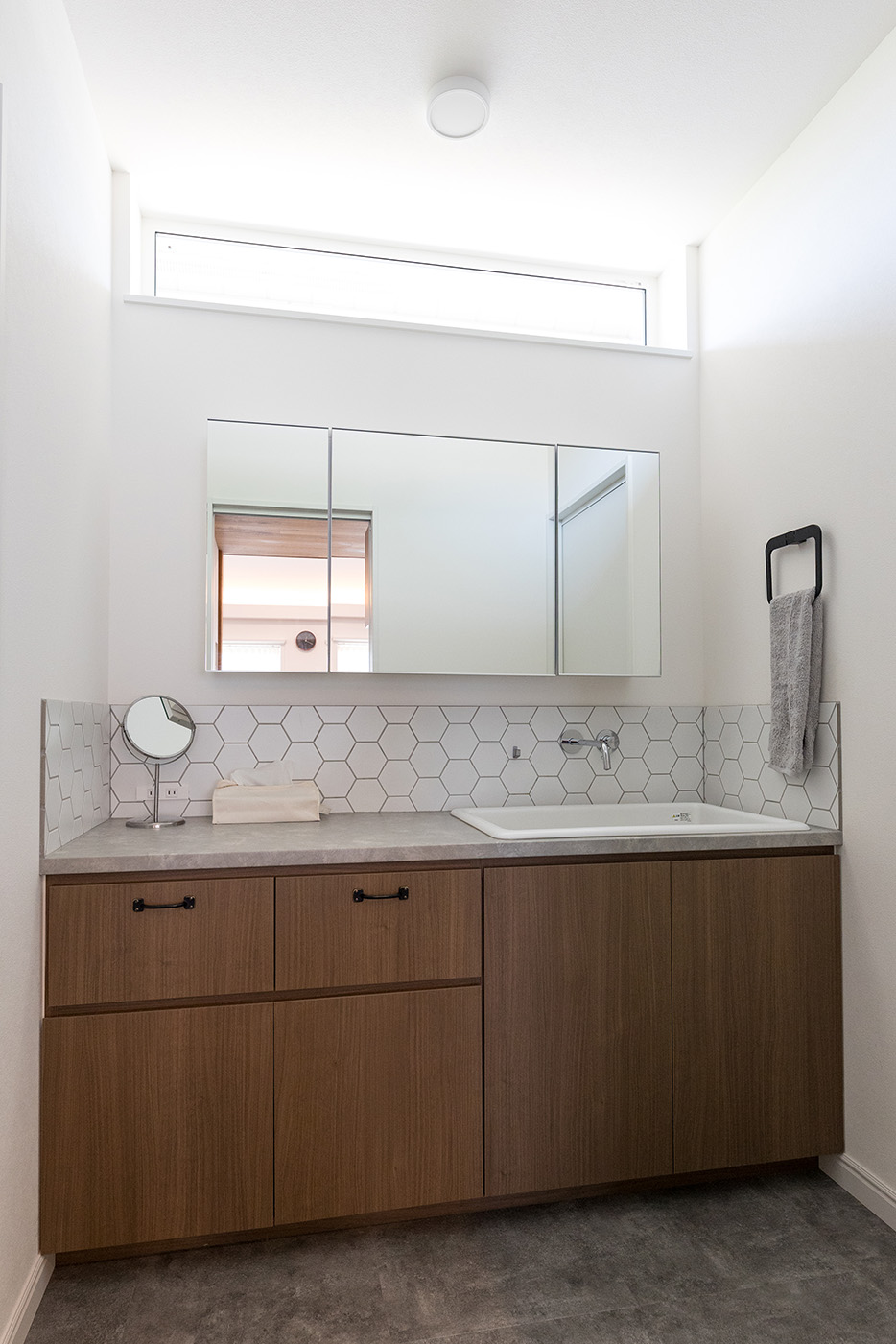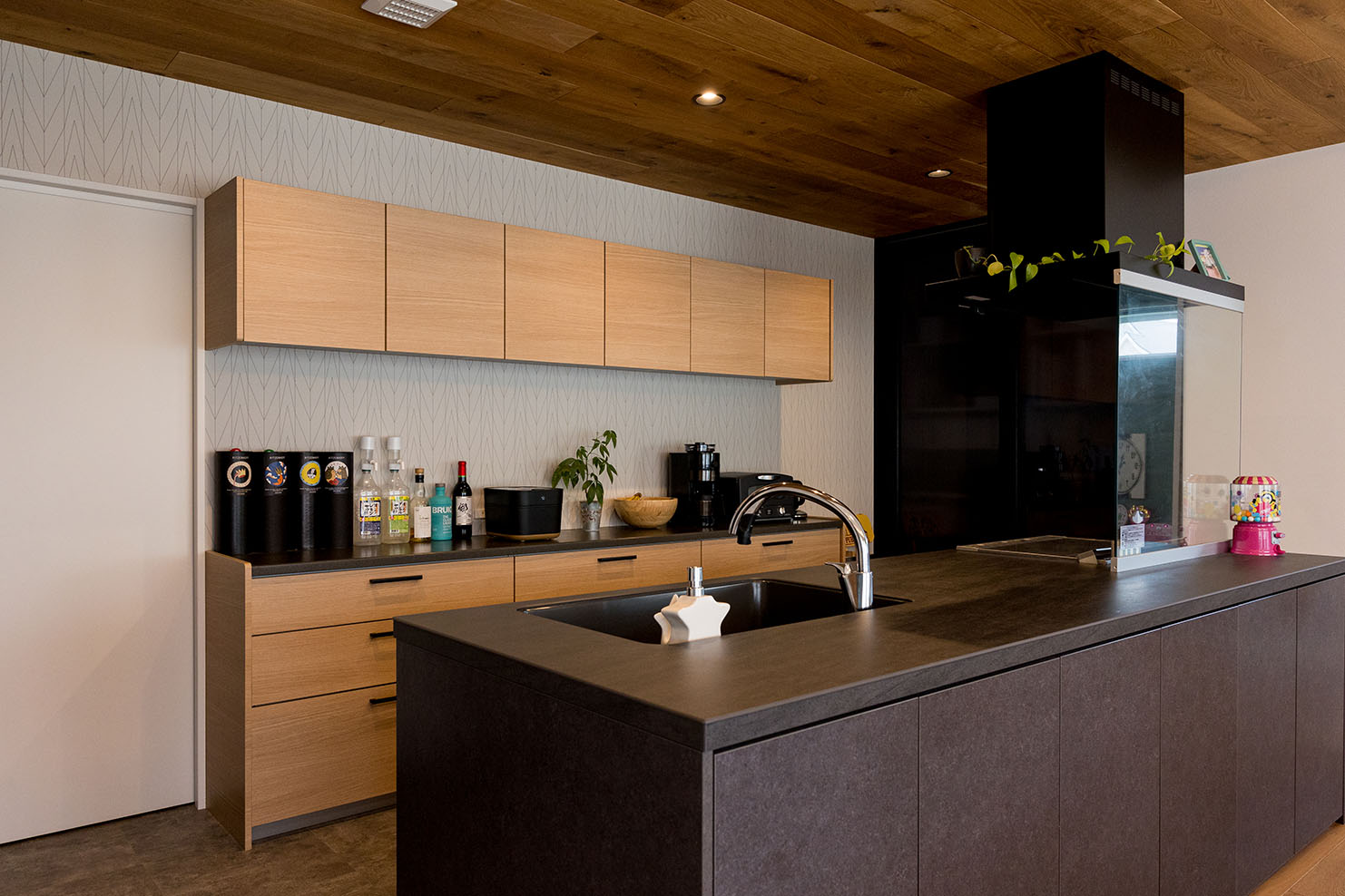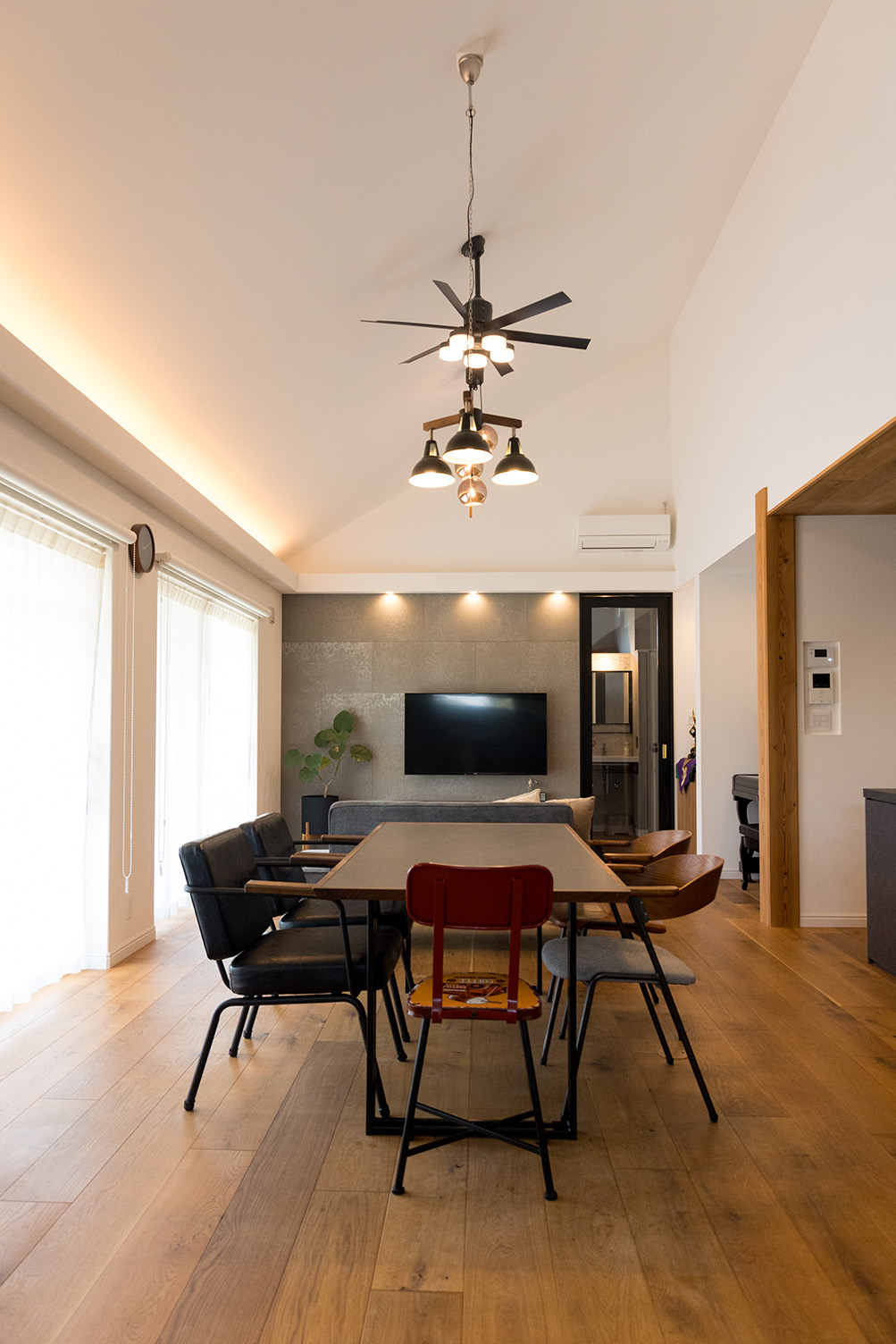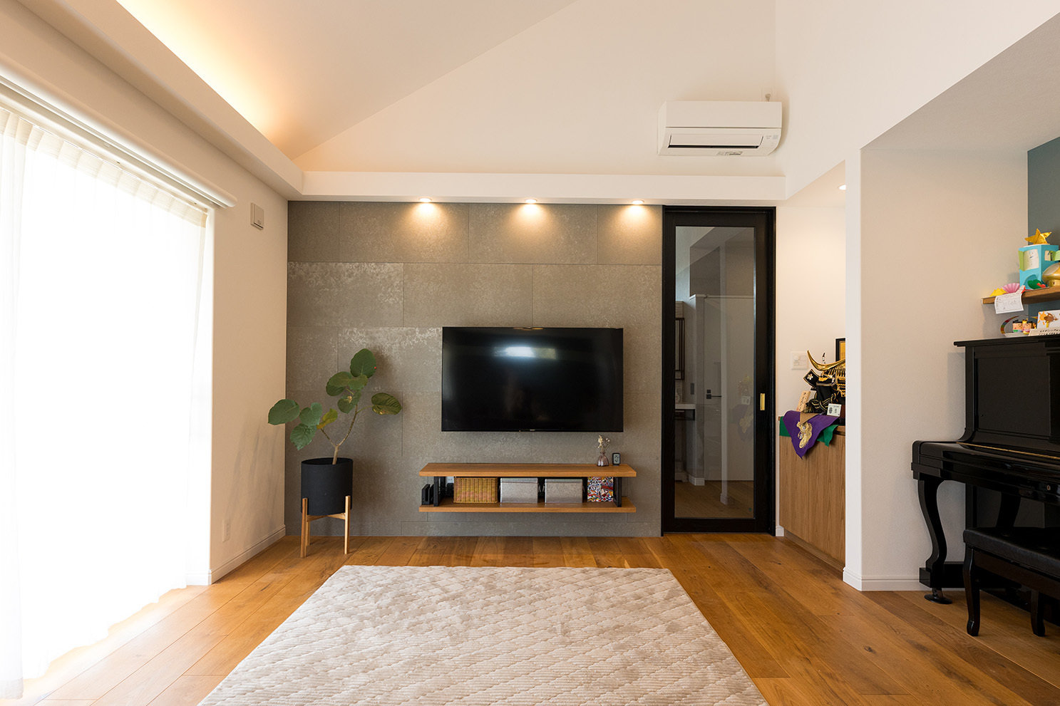 リビングの床材は優しい色味のオークを採用し、テレビ背面のSOLIDO coffee、キッチンのリシェル グレーズグレーの濃色とのコントラストがとても映える空間になりました。