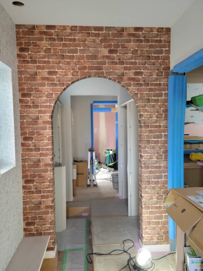 今回、アクセントとしてレンガ調のクロスを採用しているのですが、その施工がさすがでした。
