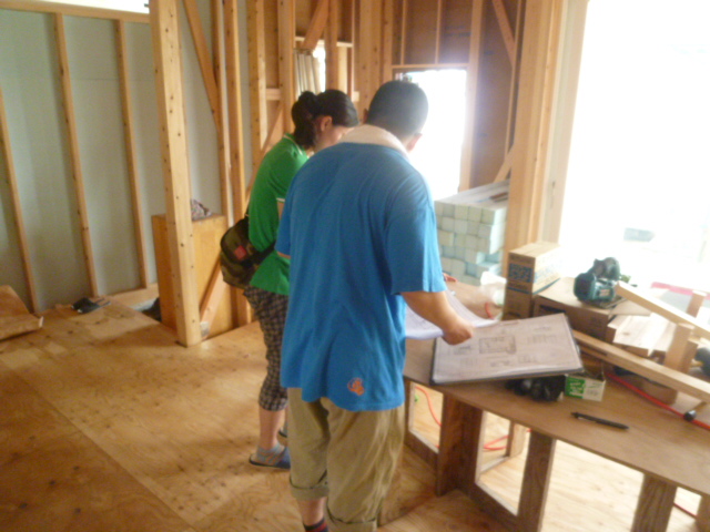 建物が上棟した後、図面を見ながら現場を確認する様子です