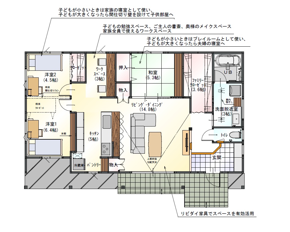 このように今の生活だけではなく、子どもが大きくなったら・・・子どもが巣立ったら・・・と将来の事を考えてお客様の要望をまとめると、とてもコンパクトな間取りにできます。