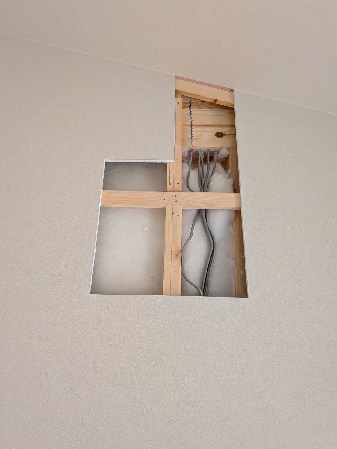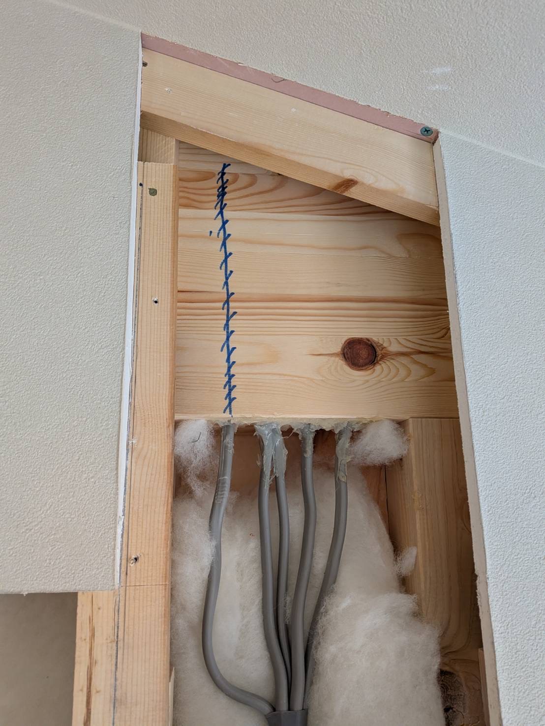 電気配線後、大工工事と内装工事が完了した現場で断線の疑いがあり石膏ボードを剥がし配線の様子を確認しました。