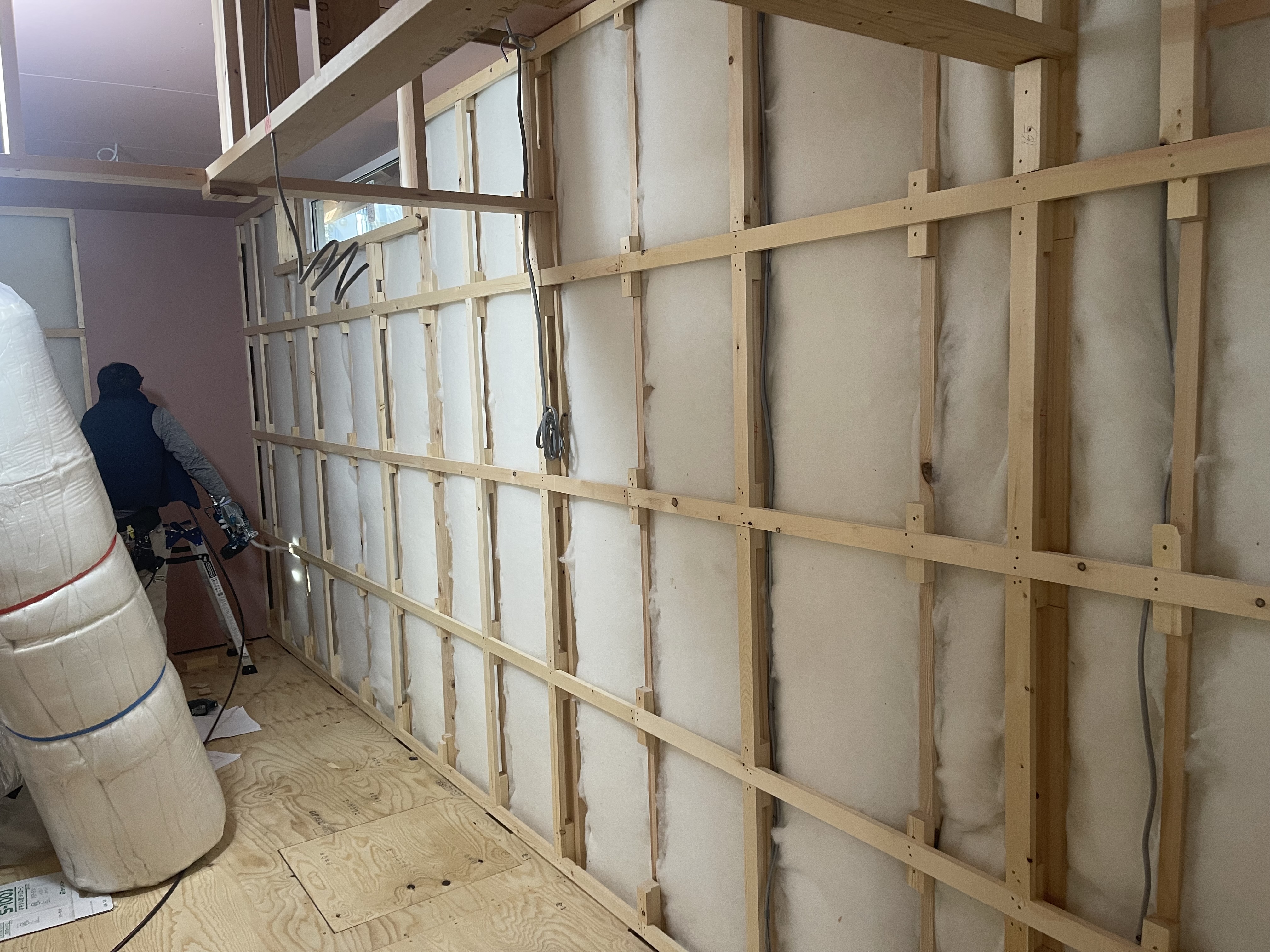 エアコンで室温を下げれば内装材も温度が下がりますが、弊社では石膏ボードの裏側に室内通気層を設ける事でボードの熱を通気層へ逃がしています。