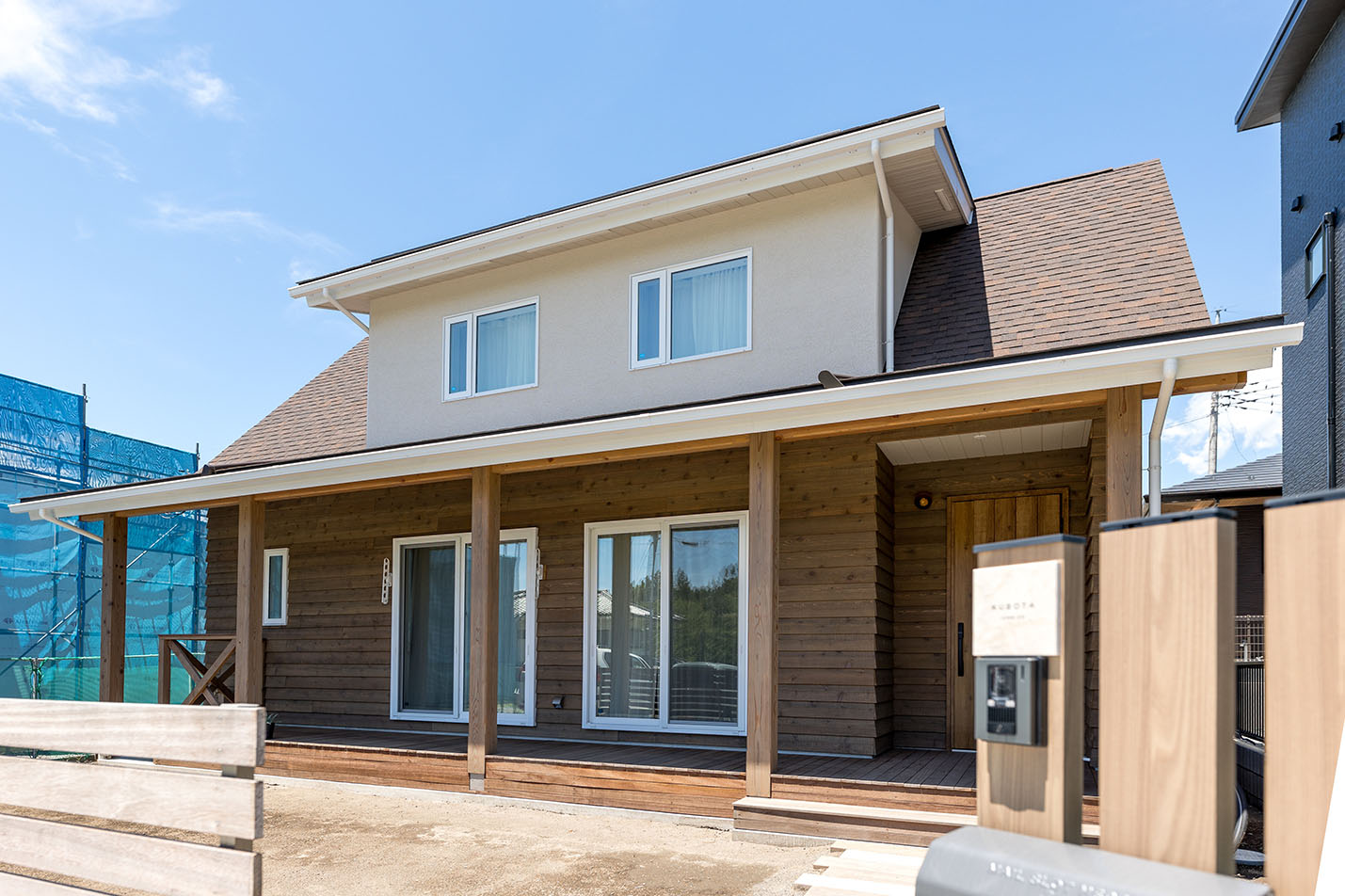 大屋根スタイルの外観に太陽光3.27kwを搭載しました。1階は米杉、2階はジョリパット塗り仕上げです。