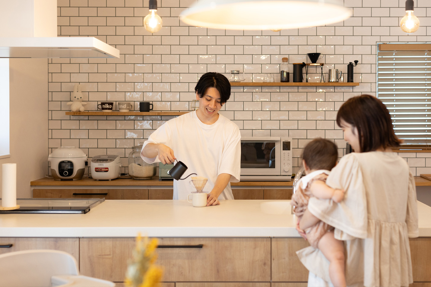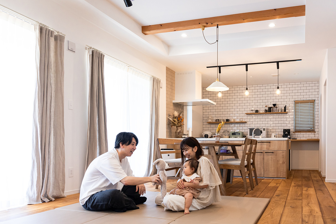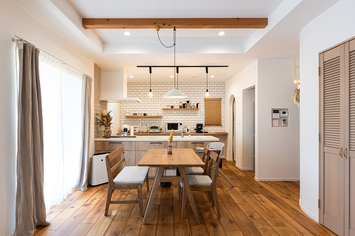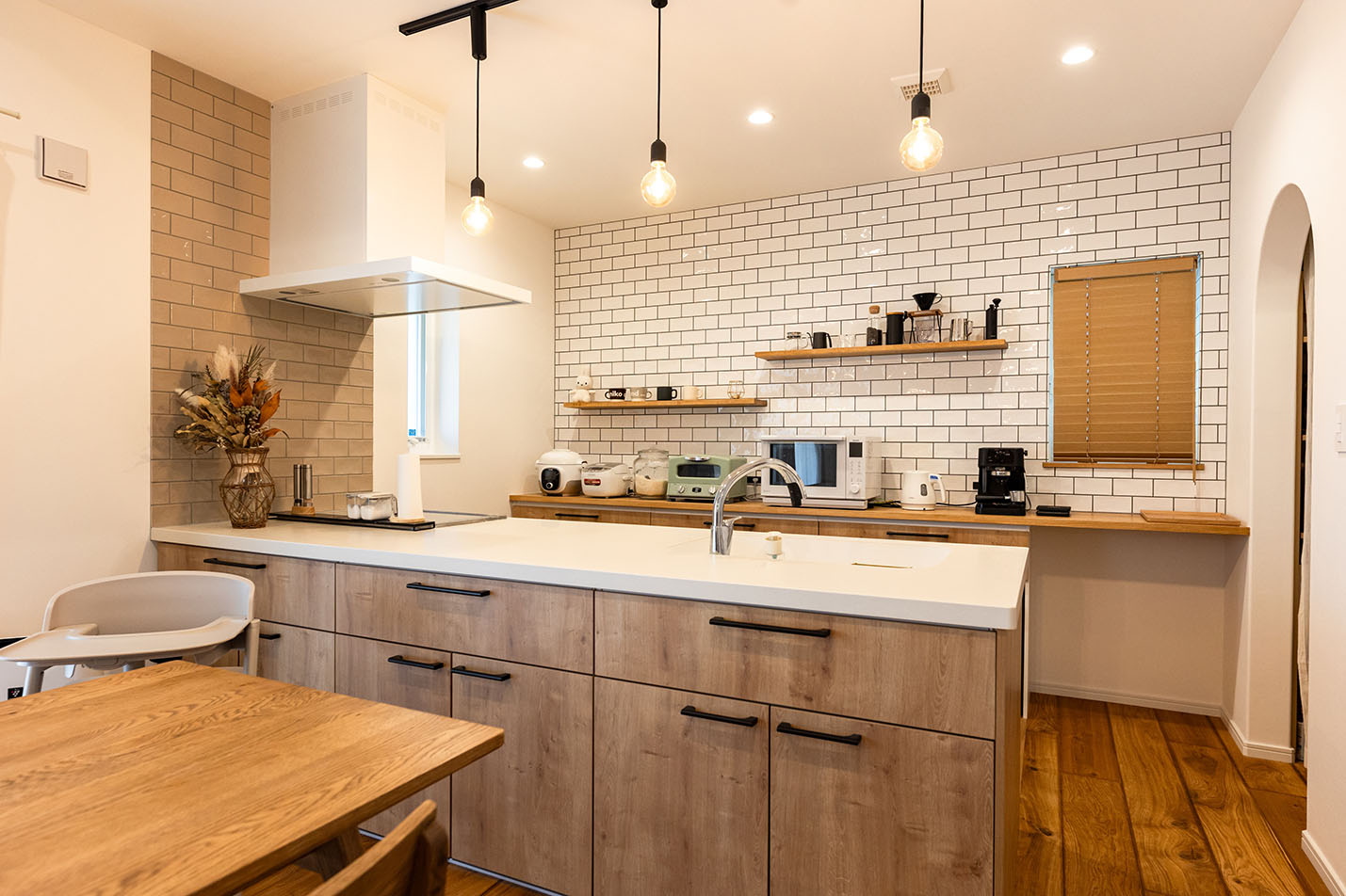 内部はホワイトカラーでシンプルに仕上げ、所々に真鍮をアクセントで使用しました。床材にはオークの無垢材、キッチンには光沢のあるかわいらしいタイルを採用し、本物ならではの豊かさある空間に仕上がりました。
