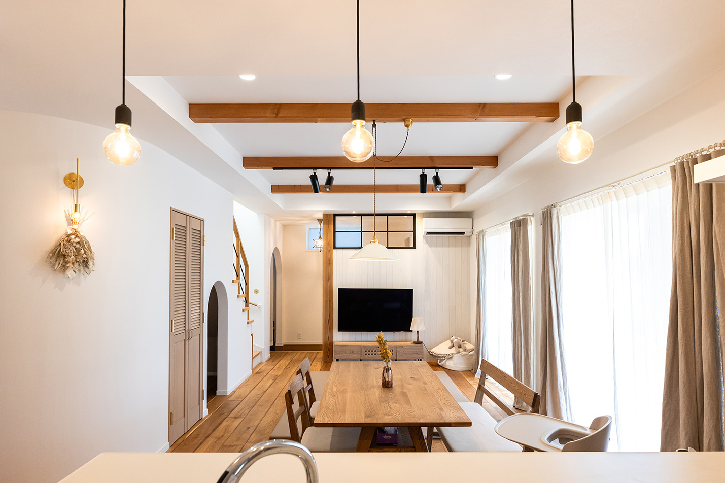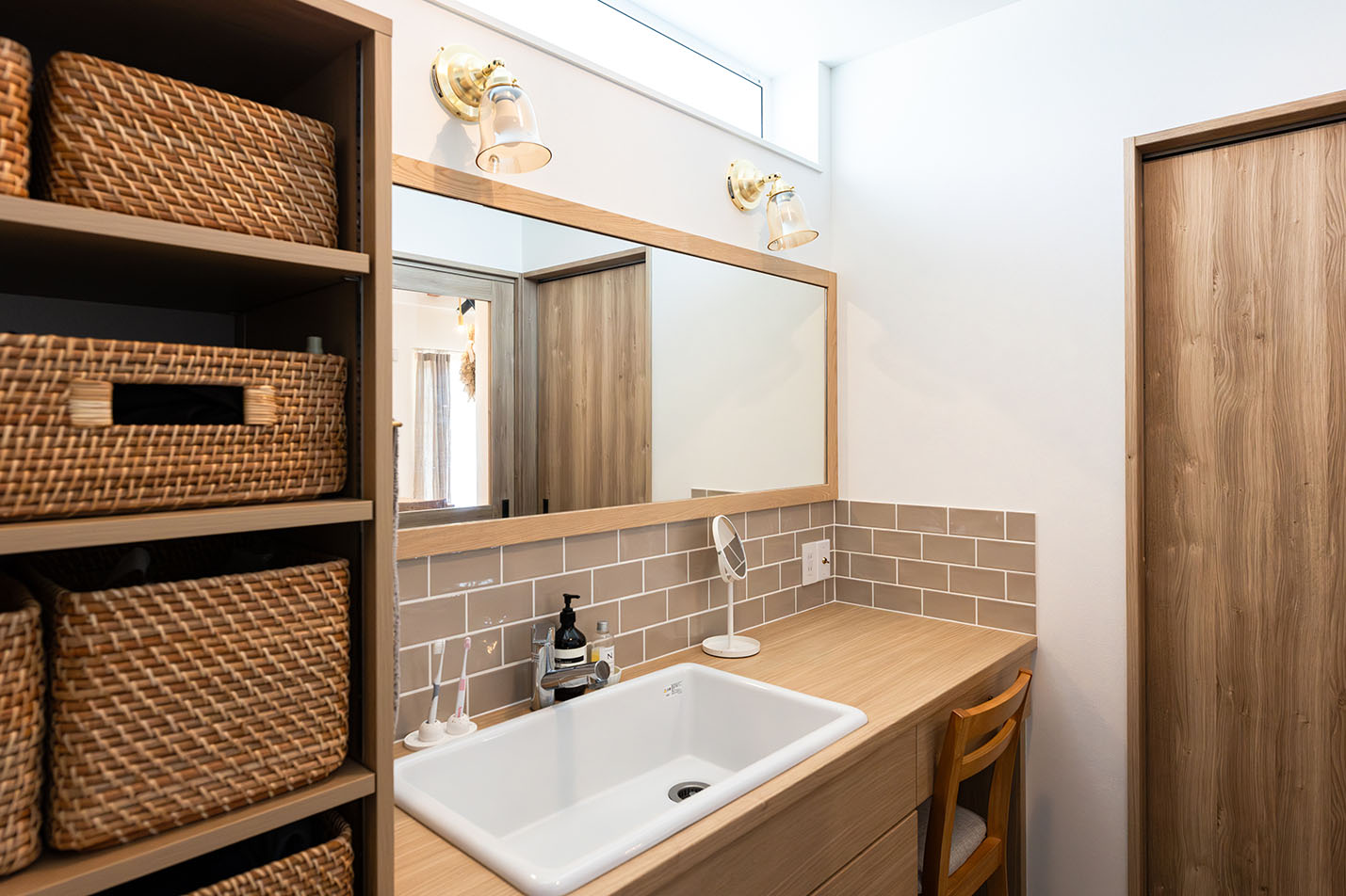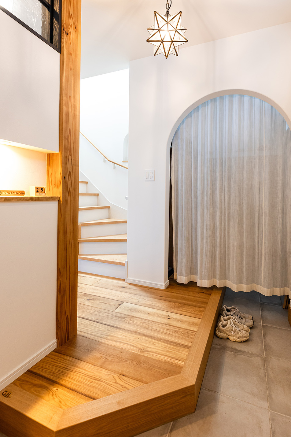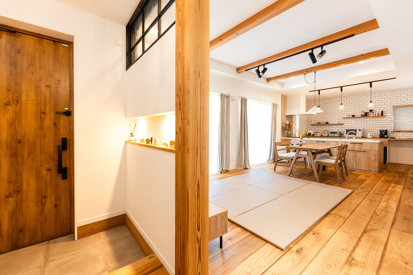 内部はホワイトカラーでシンプルに仕上げ、所々に真鍮をアクセントで使用しました。床材にはオークの無垢材、キッチンには光沢のあるかわいらしいタイルを採用し、本物ならではの豊かさある空間に仕上がりました。