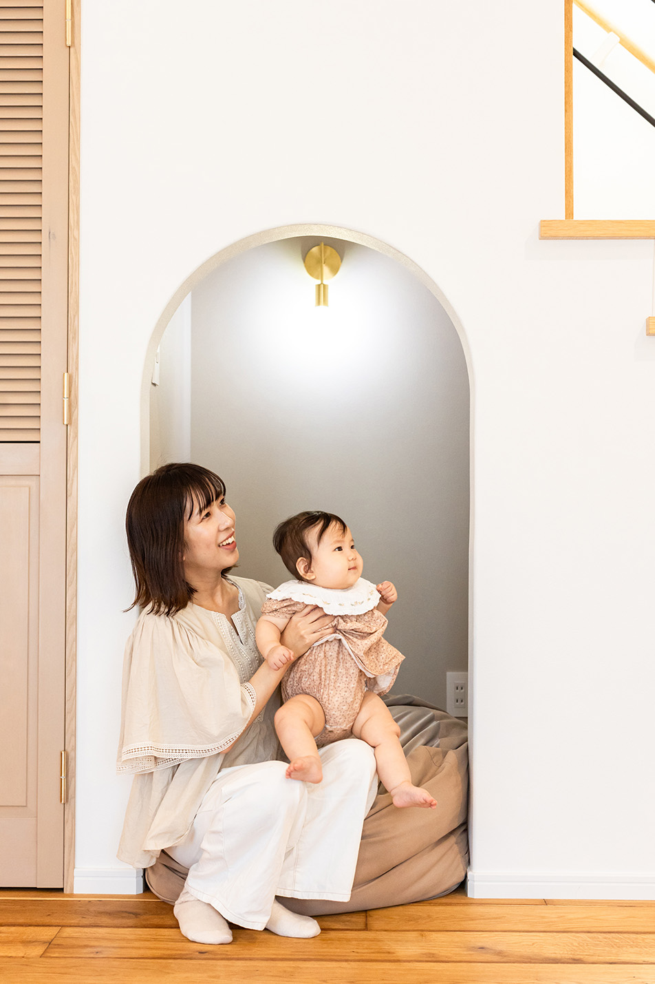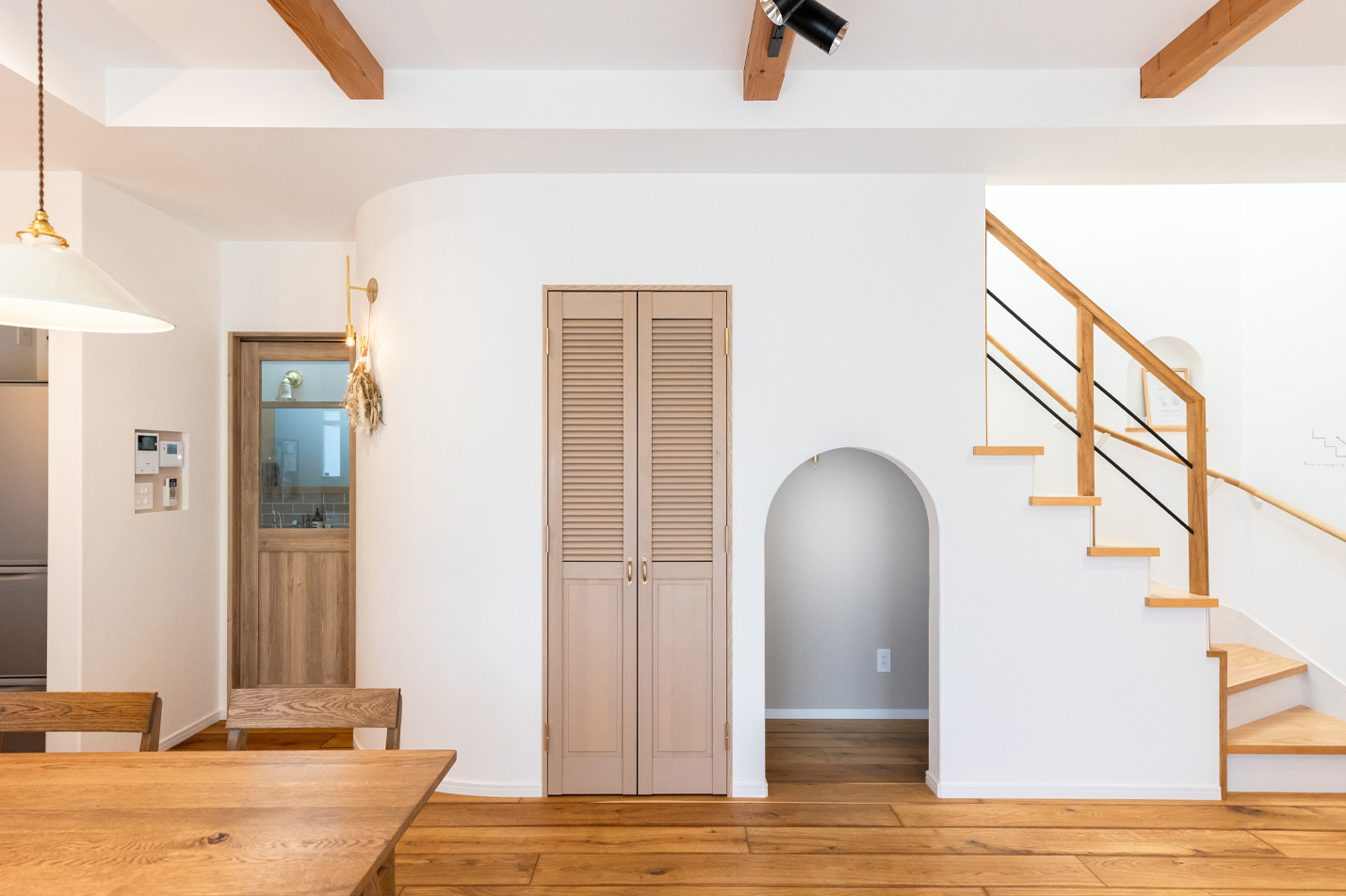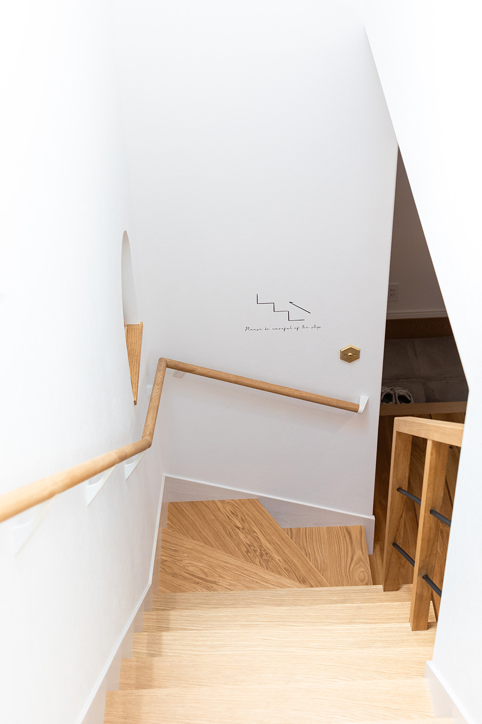 家族が一番長く一緒に過ごすLDKに階段下を利用した、使い方自由なヌック(『ヌック』とは小ぢんまりとした暖かくて心地のいい場所という意味があります。)を取り入れ楽しさをプラス、家の中心には上部に設けたトップライトから気持ちの良い自然光が差し込みます。
