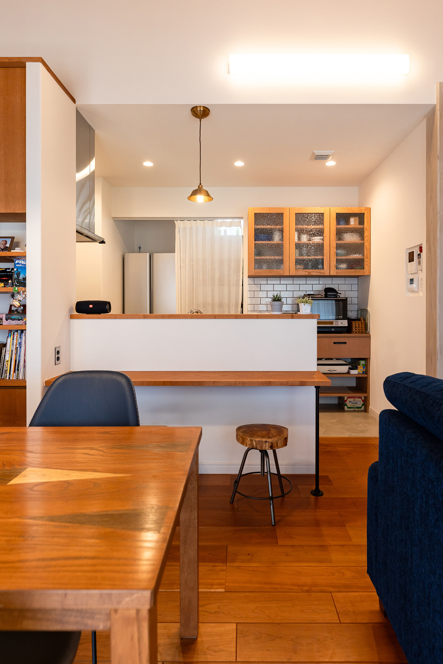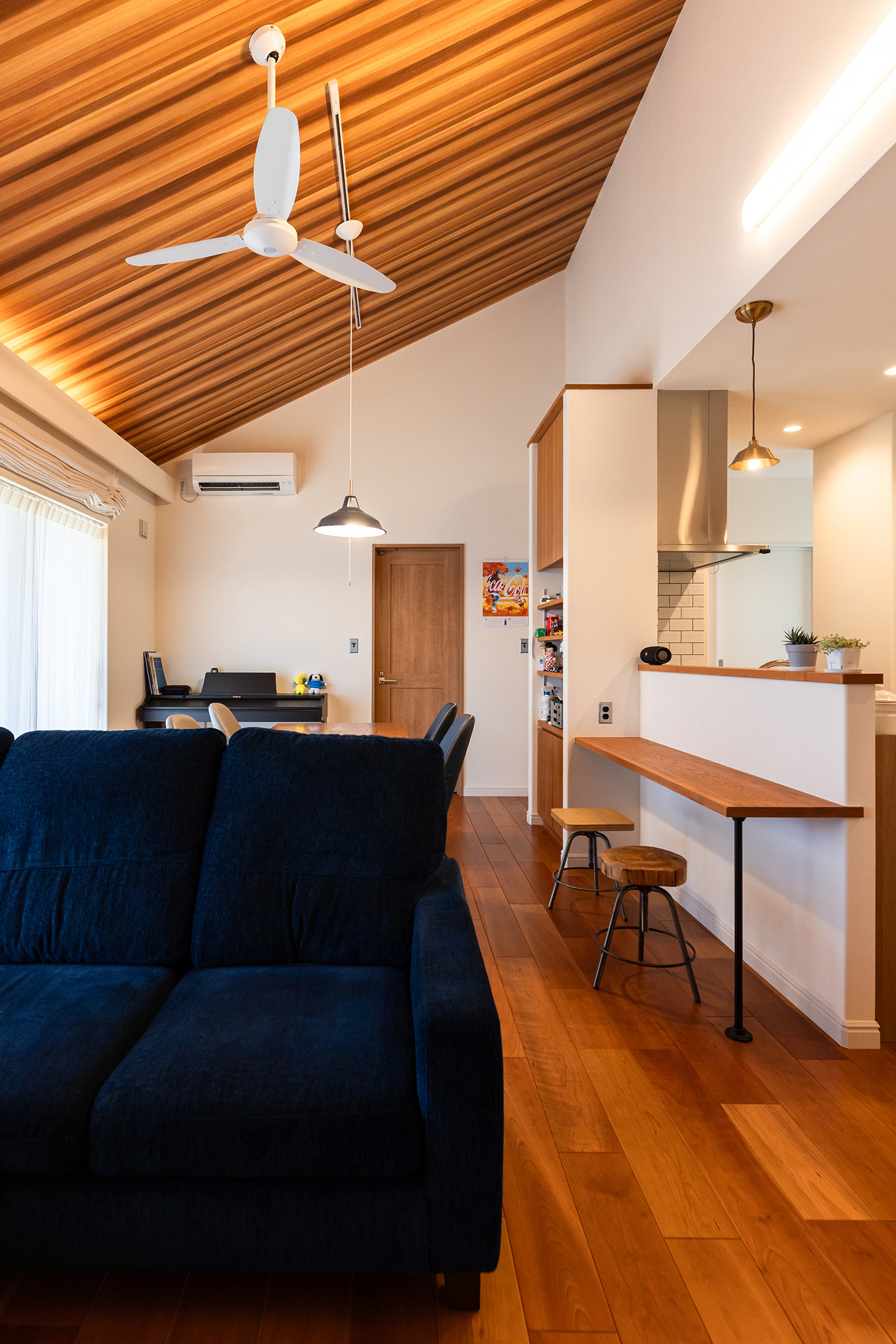 LDKの大きな勾配天井には米杉模様のクロスを貼り、スプートニクライトやオリジナルテーブルなどで、ミッドセンチュリーな空間を演出しています。