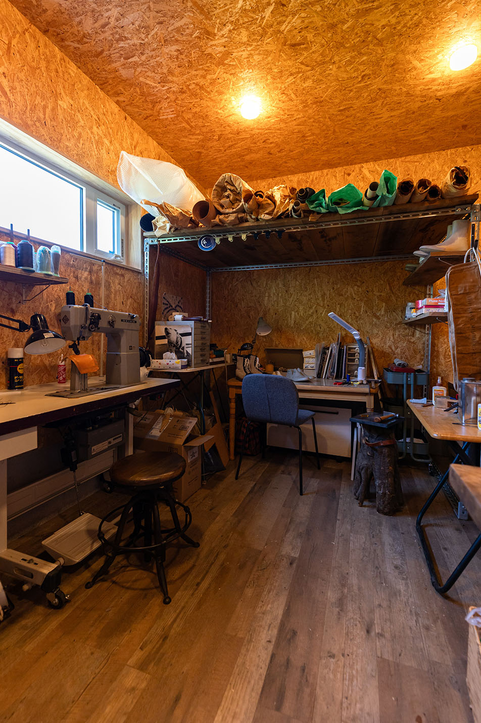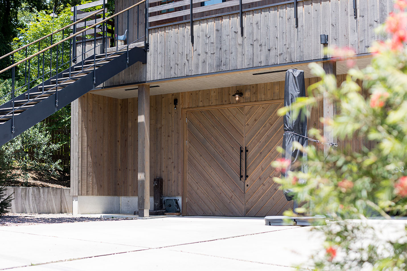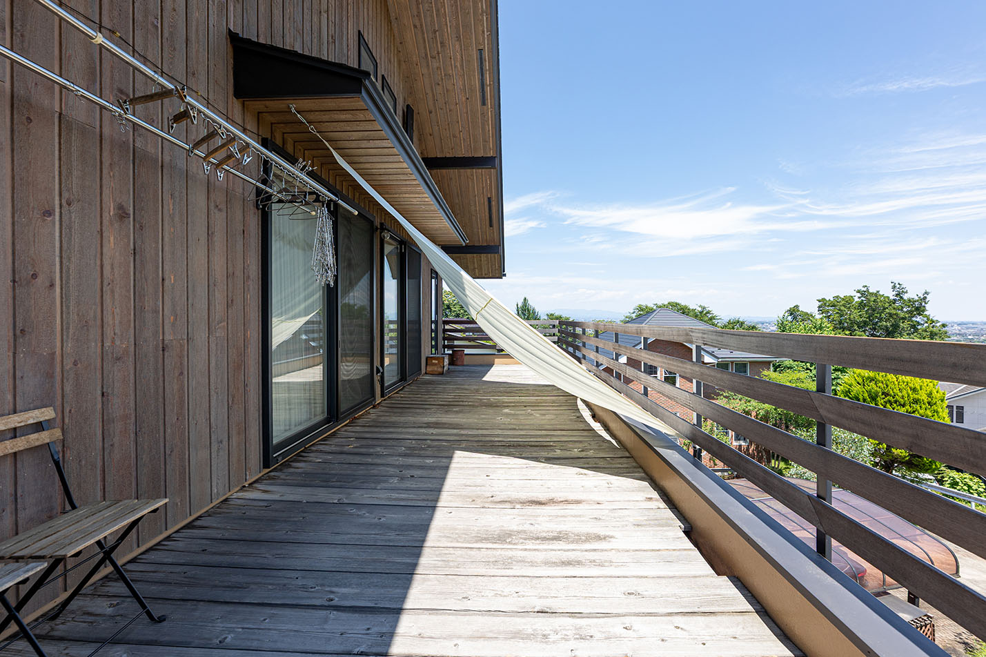 一階にはガレージと趣味の革靴を造るアトリエ。二階がエントランスとなっていて、広いバルコニーからは高崎の中心部が一望できます。