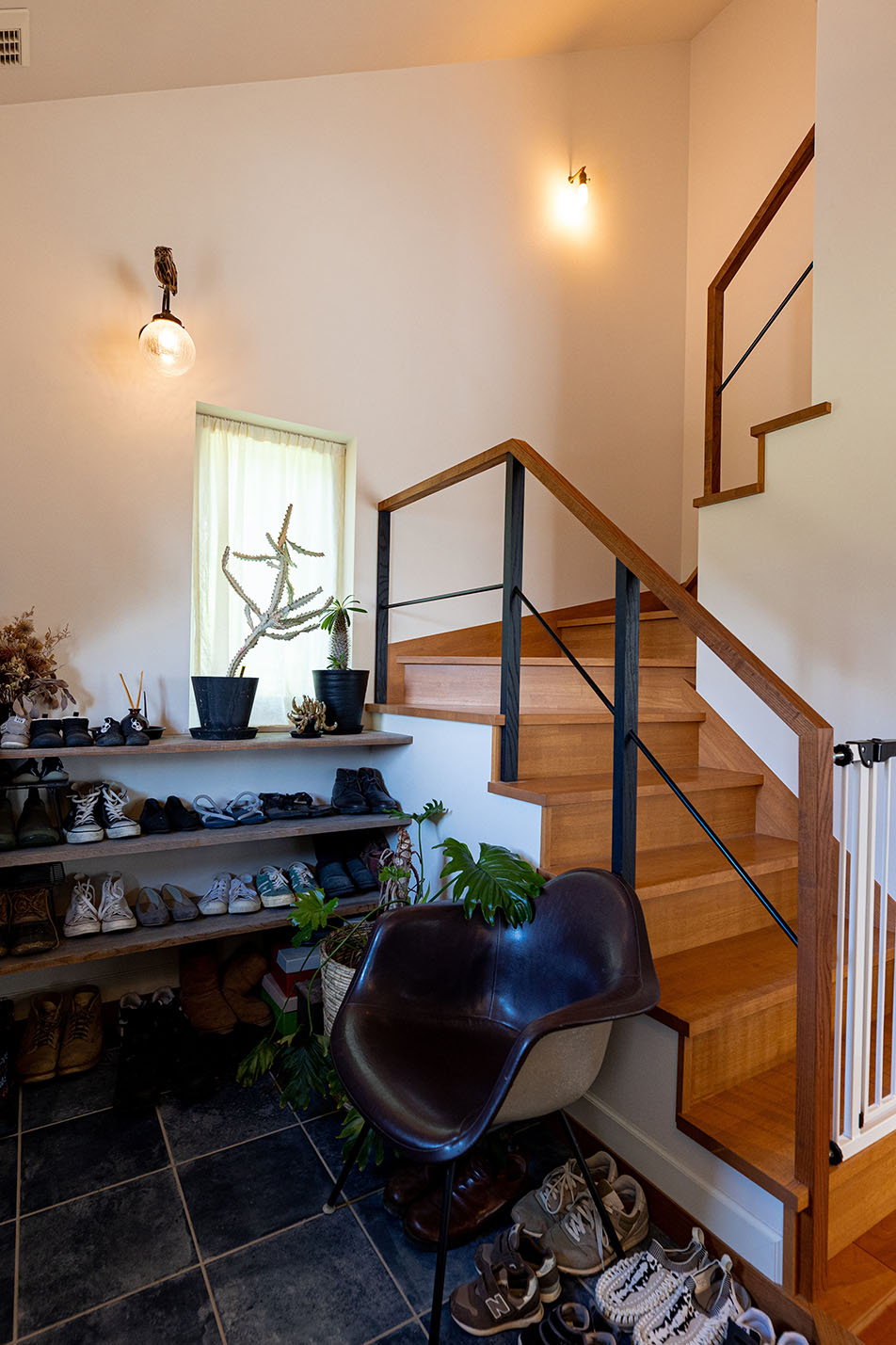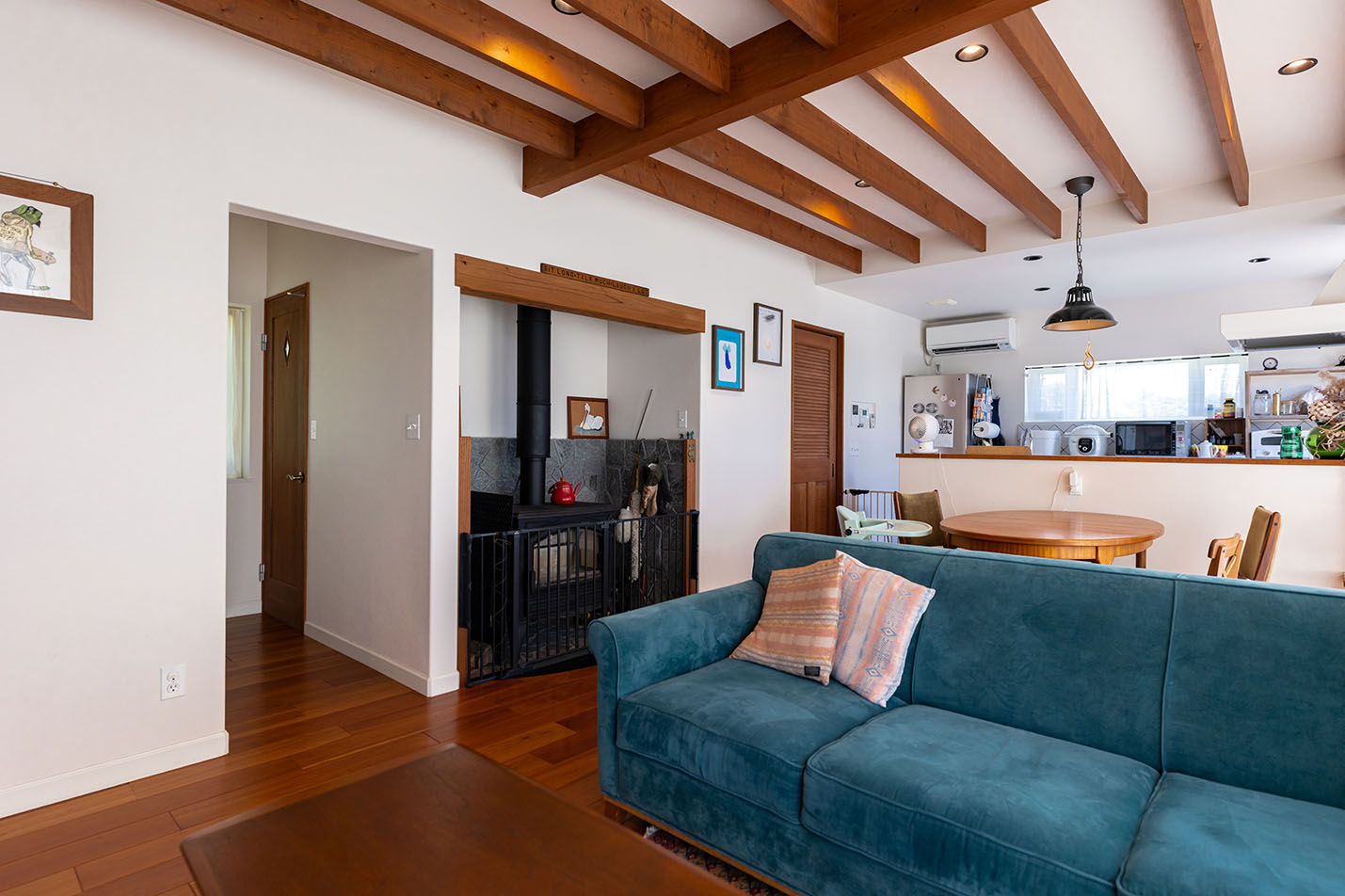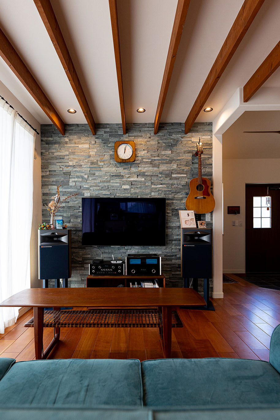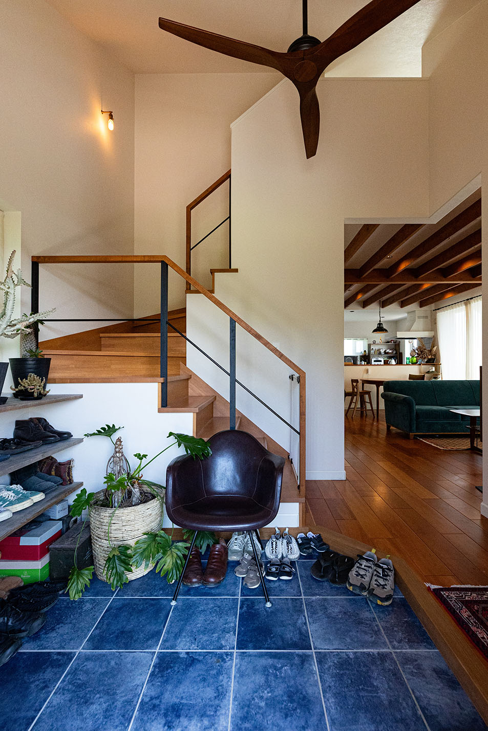 玄関ドアを開けると、デニムカラーのタイルがお出迎え。リビングの薪ストーブはエコな暮らしを実現してくれます。